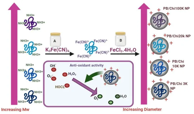 Hyperion Oh, et al. developed PB/Chi nanoparticles using many chitosan samples ranging from 3 to 100 kDa to improve the antioxidant activity and stability PB nanoparticles (Figure 2). Chitosan is a polysaccharide that is a permeation enhancer and mucoadhesive that facilitates NP retention in the administration [22]. The improvement in stability was examined by monitor change in the diameter of the nanoparticles and appearance. The antioxidant activities were examined by deoxyribose assays and 2,2-diphenyl 1-1-picrylhydrazyl(DPPH) [23].
