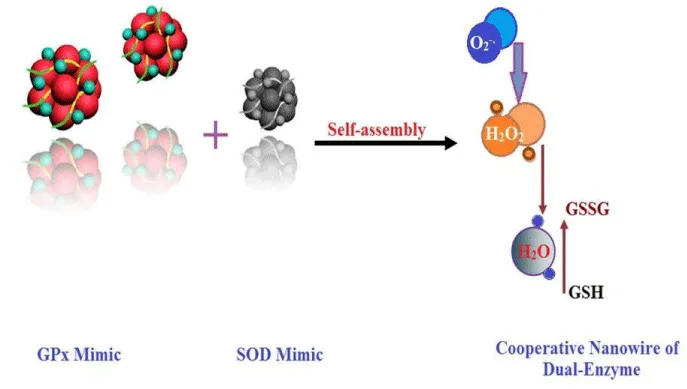 Liu and his co-workers constructed enzyme from the self-assembly of polymers with protein; this nanocomposite is used for cytoprotection. Protein (SP1) is a stress-responsive protein and has no sequence homology to other stress proteins. SOD and GPx's catalytic centre assembled into protein (SP1) and polymer nanoparticles (PD5). The electrooptic contact between polymer and protein can self-assemble and form nanowires with SOD and GPx like properties (Figure 3). These nanocomposites scavenge the overexpressed reactive oxygen species and maintain the intracellular balance [36].