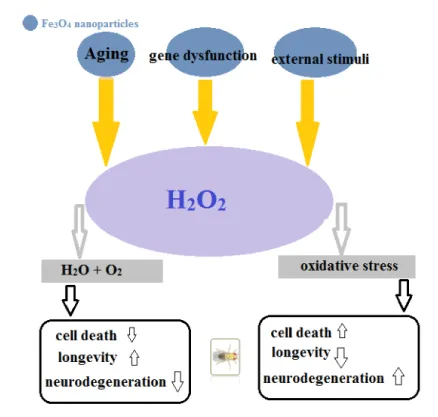 They examined the effect of Fe3O4 NPs on drosophila life span and ageing, examined drosophila on different age stages. Results showed that the aged drosophila has a low climbing ability. The daily uptake of 200µg/mL Fe3O4 NPs reduced the ROS level and improved climbing ability [38].