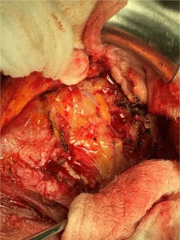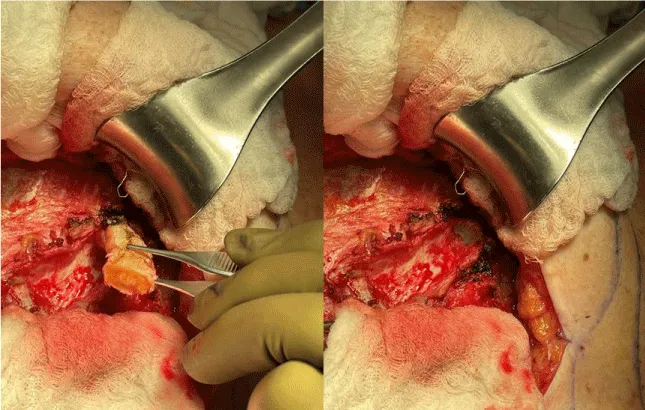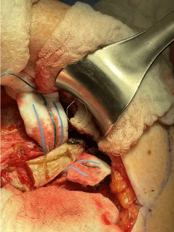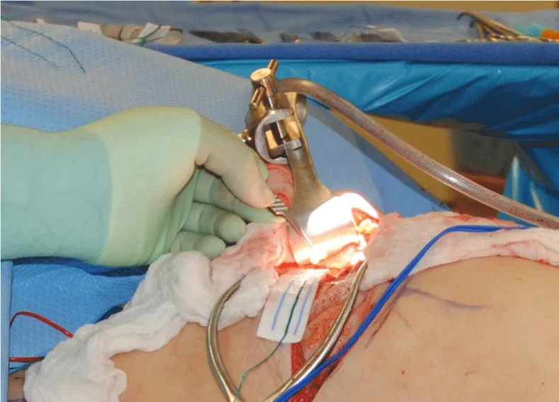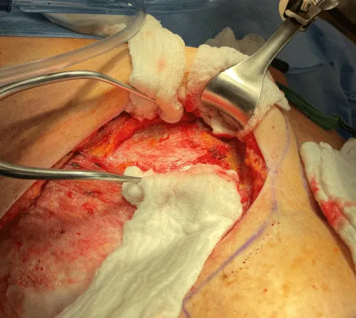 The internal mammary node harvest was done via a standard approach in all cases. The third rib was identified by counting ribs from the clavicle inferiorly to the point where the third rib could be palpated. This was done after the completion of the mastectomy in immediate cases and after the re-creation of the mastectomy defect in delayed reconstruction cases. Double hooks were placed along the direction of the pectoralis major and elevated. Bovie electrocautery was then used to dissect down to the third rib. The interspace above and below the third rib was dissected superiorly and inferiorly respectively to expose the intercostal muscles. Gelpi retractors or Goulet retractors were placed to hold the pectoralis major away from the dissection field (Figure 1). The anterior perichondrium of the third rib was scored and Freer dissection was used to elevate the anterior perichondrium off the third rib as well as the posterior perichondrium with the assistance of Doyan dissection tools (Figure 2). Once the cartilaginous section of the rib is isolated, a 1-inch x 3-inch cottonoid is used to circumferentially mobilize the posterior perichondrium (Figure 3). The segment of the cartilaginous portion of the third rib is resected (Figure 4) and the posterior perichondrium was removed as well as a portion of the intercostal muscles above and below the third rib (Figure 5). The internal mammary vessels were identified and the artery and vein were separated from each other (Figure 6). During the internal mammary vessel dissection, an internal mammary node, when identified, was dissected free and sent to pathology for microscopic examination. If the vessel diameter at the level of the third rib is insufficient for microvascular anastomosis then the dissection proceeds to the level of the second rib. If an internal mammary node is identified in this intercostal space, the internal mammary lymph node is submitted to pathology as well.