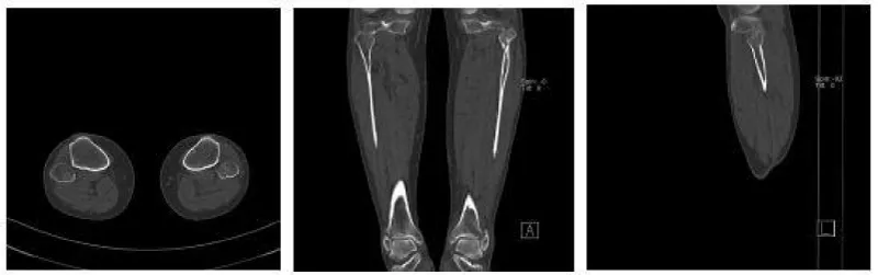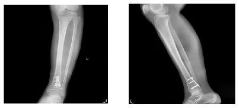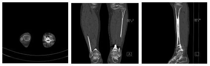 The anesthetic for the operation was lumbar anesthesia. A posterolateral approach was used to expose the Volkmann fracture. An anterior tibial approach was used to expose the Tillaux-Chaput fracture. The inferior tibiofibular joint was checked carefully. Fractures were reduced and then fixed. Volkmann fracture was fixed by buttress plate, and Tillaux-Chaput fracture was performed by hollow screw. Hook test intraoperative was negative. Anatomical reduction and perfect stability were confirmed by X and CT postoperatively (Figures 6.7). CT scan in the transverse section confirmed that the anterior and posterior edge of the distal fibula is in an arc with the fractures of the tibia. It meant there was no dislocation of the distal fibula. The anterior and posterior ligaments of the inferior tibiofibular ligament are in good condition.