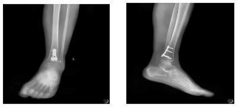 Three weeks after surgery, the patient is required to touch down weight-bearing in a plaster splint. Patients are then allowed partial weight-bearing after six weeks and progress to weight-bearing. Ankle joint function exercises can be done three weeks after surgery. X noted that the fracture healed without shortening or rotation of the fibula when twelve weeks after surgery (Figure 8). The AOFAS score is 92 at twelve weeks follow-up [7,8].
