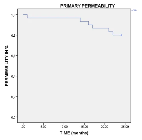 A clinical checkup at 1 month, 3 months, 6 months, 12 months and 24 months post angioplasty were performed. Our primary permeability rates at 12 months were 96.6% and at 24 months were 80% (Figure 1).