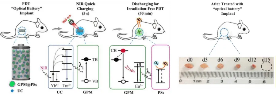 One strategy to enhance the efficacy of photosensitizer is to combine it with Persistent Luminescence Nanoparticles (PLNPs). PLNPs have a special property of emitting light for a long time, from minutes to hours, after being excited. This prolonged luminescence from PLNPs is very beneficial for PDT because it extends the activation time of the photosensitizers without needing more light energy. In addition, this means that PDT can be more localized and controlled, minimizing damage to healthy tissues [40,41]. Lidan Hu, et al. [42] have developed a new type of PDT implant called “optical battery” which is a Near-Infrared (NIR) rechargeable PDT implant for irradiation-free PDT. The implant was fabricated by embedding upconversion materials, green persistent luminescence materials (SrAl2O4: 2%Eu2+, 4%Dy3+), and photosensitizer into Polydimethylsiloxane (PDMS). The implant can be charged quickly with a 980-nm NIR laser for just 5 seconds. After charging, it can produce green persistent luminescence and generate cytotoxic singlet oxygen for continuous irradiation-free PDT for almost 30 minutes without requiring external irradiation. The brightness and fading speed of the persistent luminescence do not change significantly when the charging time is extended from 5 seconds to 30 seconds at a power density of 2 W/cm2. The in vitro results showed the tumor volume greatly decreased after the multiple circulation of NIR irradiation in 15 days (Figure 1). This means that the PLNPs can be fully charged in just 5 seconds of NIR exposure, which minimizes the risk of overheating and cell damage caused by long-term irradiation. X-ray photons have much greater penetration in body tissues. X-ray-activatable PDT could be initiated from virtually any part of a body with high efficiency. The Chen group [44] pioneered in demonstrating in vitro that low energy X-rays can activate a novel integrated nanosystem, which consists of a core made of SrAl2O4: Eu2+ and a silica coating loaded with a photosensitizer, merocyanine 540 for cancer cell destruction. SrAl2O4: Eu2+ is a strong luminescent material that can convert X-ray photons to visible photons. Matching the excitation wavelength of the photosensitizer, the visible photons can activate the photosensitizer, producing cytotoxic O2. SAO also can enhance sensitivity for deep tissue bioimaging in animals through soft X-ray-mediated photon energy charging into it [45]. The long-lasting phosphorescence properties of SAO nanoparticles enable novel PDT modalities with improved therapeutic indices. The exact mechanisms of how SAO nanoparticles store and emit energy are still being investigated. However, their ability to act as an internal light source makes them a promising nanoplatform for advancing PDT.