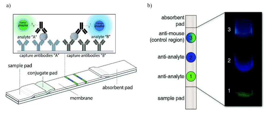 Biosensors: The luminescence of SAO nanoparticles can be harnessed for the development of biosensors. Biosensors are specialized analytical devices that combine a biological component with a physicochemical detector to detect and quantify specific biological molecules or chemical compounds within a sample [57]. The ability of biosensing probes to selectively and sensitively detect target molecules is essential for chemical and biomedical detection. For example, the detection of tumor biomarkers, metabolites, biomolecules, and other signal parameters in living cells is important for disease diagnosis and treatment. PLNPs can be functionalized with specific biomolecules, such as antibodies or DNA probes, to create a highly sensitive and selective sensing platform. These particles can eliminate background noise interferences due to their long-lasting afterglow nature. In particular, NIR-emitting PLNPs have high penetration depth in biological tissues, good photo- and chemical stability, and low toxicity, making them ideal for biosensing applications [58]. Lateral Flow Assays (LFAs), also known as immunochromatographic assays, are a type of diagnostic test commonly used for the rapid and qualitative detection of specific target analytes, such as antigens or antibodies, in a variety of biological samples. To overcome the limitations of conventional fluorescent labels, upconverting phosphors were studied but they showed low quantum yields [59]. Paterson, et al. [60] for the first time suggested using strontium aluminate PLNPs as reporters in LFAs with biotinylated Hen Egg Lysozyme (bHEL) as a model analyte. These PLNPs could emit intense visible light for several minutes after excitation which helps to eliminate the need for optical filters and decrease background autofluorescence. In their recent study [61], they incorporated two persistent PLNPs in a multiplex LFA to simultaneously detect two independent model analytes, Prostate-Specific Antigen (PSA) and human Chorionic Gonadotropin (hCG). The extended emission lifetime of PLNPs means that they don’t require continuous excitation. As a result, they can be imaged using a smartphone-based time-gated imaging system, which allows for the creation of a straightforward, rapid, and cost-effective point-of-need diagnostic method. This method can be used to quickly detect analytes (Figure 2). Jiang, et al. [62] in a novel study, investigated the potential of Mechano-Luminescence (ML) properties of SAO nanoparticles in evaluating the occlusal examination of artificial teeth. The bright and sensitive ML emitted by the artificial tooth models can guide clinicians in adjusting the occlusal surface until a balanced occlusion is established. This can help ensure that the patient has a comfortable and functional bite.