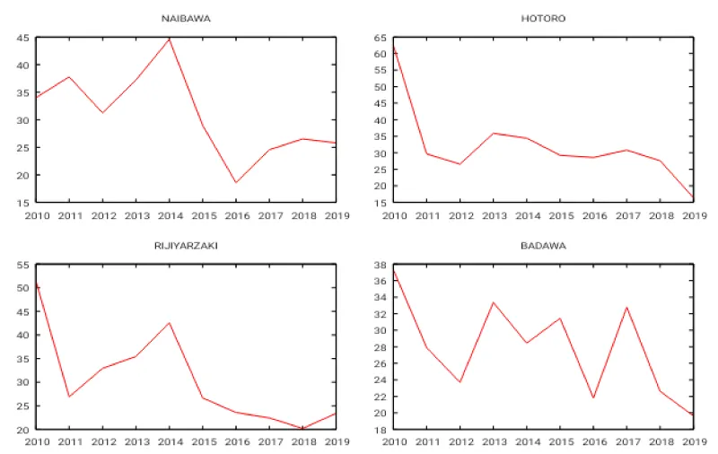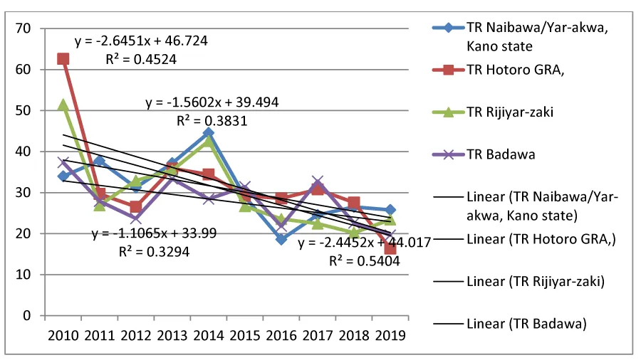 The graphical result from Figures 1,2 shows the Trends of total returns of residential properties in Naibawa/Yar-Akwa, Hotoro/GRA, Rijiyar-Zaki, and Badawi in Kano metropolis for tenement property, two-bedrooms, and three-bedrooms. Deduction from the graph indicated that Hotoro/GRA have the highest total returns in 2010 followed by Naibawa/Yar-Akwa in 2014, consequently, the total returns flow is volatile, though the point of fluctuation in total returns are positive. The trend equations for the different property market is shown in the graph with the R2 values illustrating the goodness of fit of the model. The rule of thumb is that the closer the R2 value to 1 or 0.5 the better the predictability. The peak of the predictability is at 54%.