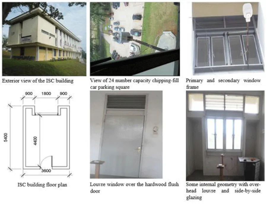 Each room has a ceiling covered with a 2ft x 4ft mineral fiber ceiling board. The case study room window encompasses a primary wooden frame and a secondary glass iron frame side hung in Figure 3. The window has an overhead louver window of 0.5m×1.8m, possibly for ventilation and daylight, with a side-by-side fixed glass window for natural lighting in Figure 3. The hardwood timber flush door also contains an overhead louver window of 0.5m×0.9m, probably for ventilation Figure 3. The ceiling to floor height is 3.6m, with a total room volume of 57.02m3. The case study office room is typical for the international students’ Society (ISS). The room has installed a unit of ceiling fan only and may need the practice of window opening due to the poor thermal performance of the single-sided ventilated room.