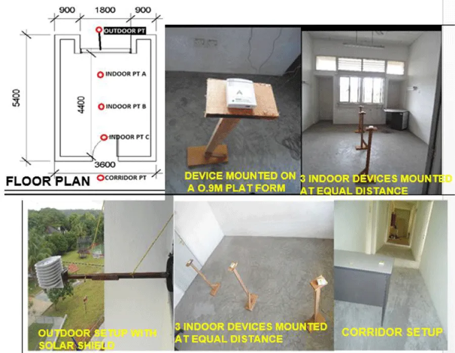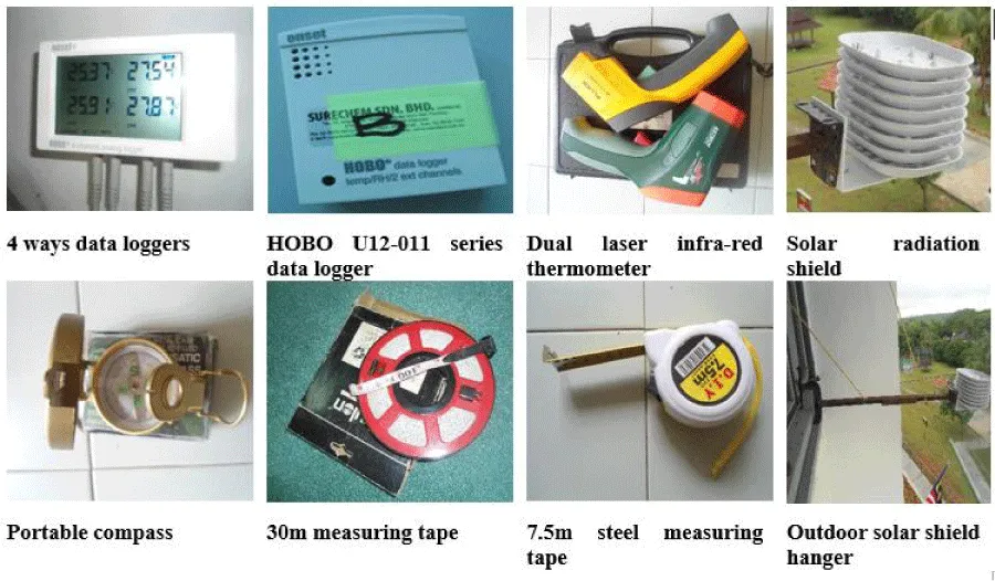 The measurements were conducted outdoors and indoors of the recessed wall façade room at a height of 0.90m above ground level. This height is the possible measure for a reasonable sitting position when carrying out an office task. Three indoor points were identified for investigation at the office room, one point in the corridor and one point at the outdoor about 1.5m from the façade wall and horizontal to the indoor points for a better and more accurate corresponding result as earlier shown in Figure 3. The measurable parameter is the air temperature (°C) which can determine the thermal environment condition inside the office room of the recessed wall facade. These measurable parameters were recorded at 10minutes intervals but were computed hourly, indoor and outdoor during the whole period of the experiment (diurnal and nocturnal recording). But, only office occupant hours from 7am to 5pm for two weeks nonstop at all points were considered for precise handling of the data. The night measurements from 6 pm to 6 am were excluded in this study since the occupancy period of office buildings is confined to 7.00 am to 5.00 pm in Malaysia. The measuring device used for the air temperature is HOBO U12-011 series data loggers because the device’s specification suits the requirement of this study, as shown in Table 2. Also, four chambers Hobo data loggers with wire-probe sensors and dual laser infrared (IR) thermometer were used to measure the surface temperature of the façade walls. Portable compass and measuring tape were used to determine the orientation of the building and measure distances of the room geometries, respectively Figures 5,6.