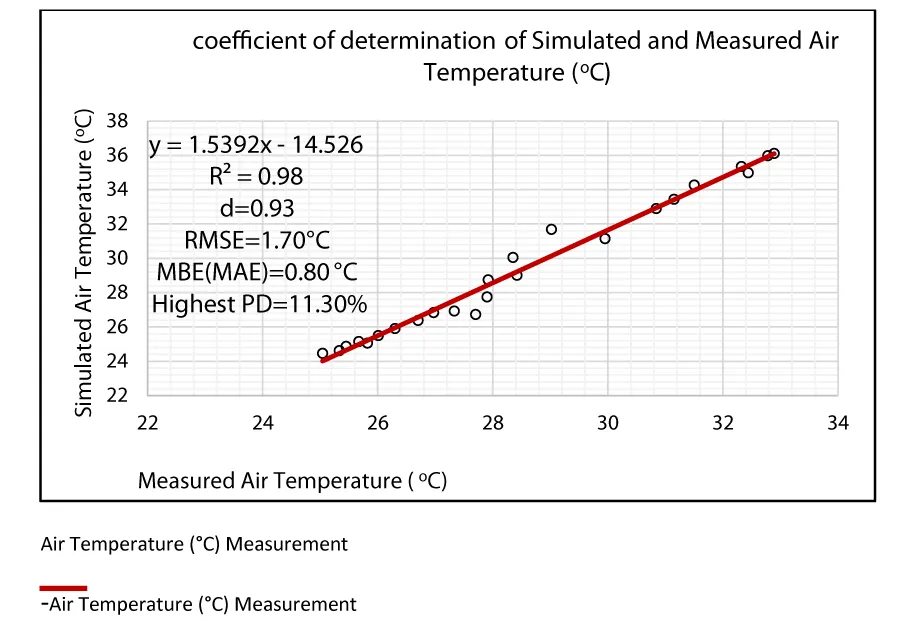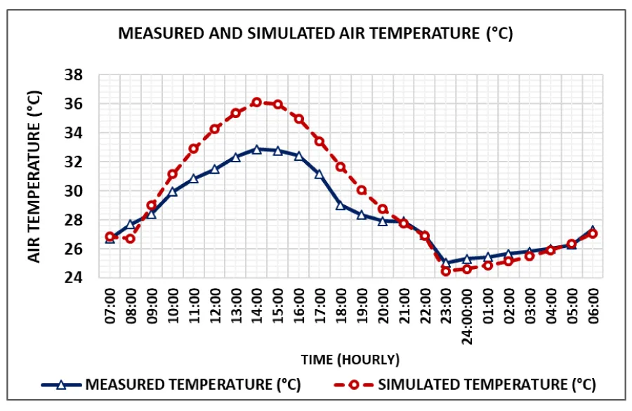 However, for an accurate model, the index of agreement (d) should either be equal to one (1) or approach one (1) [14]. Therefore, the value of d=0.93 in this measure signifies a good accuracy and precision of the model since mathematically, the value is almost 1.0. This index of the agreement provides the amount to which the simulated is free from error [14,19,20]. On the other hand, since there is no definite range of RMSE, it varies with the type and nature of the dependent variable (DV) [21]. Nevertheless, established previous literature evaluation has indicated that the measured (X) and the simulated (Y) air temperature in Figure 9 shows an (RMSE) of 1.70 Figure 9, which is a statistically negligible error. RMSE is influenced more strongly by big errors than by minor errors. Its range is from 0 to infinity, with 0 being a perfect score [22-26].