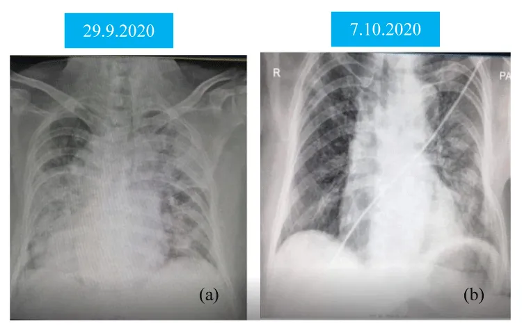 A-91-year old man had fever, cough with dyspnoea for 7 days and was brought to hospital. He was previously healthy and lived with caring family. He did not have dementia and was ambulating well. He was not diabetics nor hypertensive. His nasopharyngeal swab for Covid-19 PCR was positive. His SaO2 on air was 83% and respiratory rate was 28/minutes. Chest Xray was consistent with severe pneumonia as patchy opacities occupied more than 50% of lung parenchyma on both sides (Figure 1(a)). His total WBC was 31.6 X109/l and absolute lymphocyte count was 2.2 X109/l. He had high LDH (1262 U/L), high CRP (297.94 mg/l) and serum creatinine was marginally raised (1.6 mg%) Thus, he was treated as a case of severe Covid-19 infection with oxygen 10L/min, imipenem, azithromycin, dexamethasone, low molecular weight heparin, vitamins and dexamethasone. Convalescent plasma therapy was given on Day 12 symptom onset.