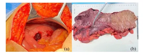 Another case was a -34 - year man, obese (BMI 36), with severe Covid-19 infection. He got occult colonic perforation following interleukin - 6 receptor antagonist therapy. They identified SARS-CoV-2 virions in the colon by electron microscopy [8]. In their description, abdominal examination did not reveal features of peritonitis i.e., similar to initial findings of our case. The intestinal complication involving both small and large intestine was also recognized in a patient with Covid-19 infection who received treatment with tocilizumab. He was 43 year and he had ulceration in ileum with colitis and ileal perforation [9]. They assumed that the possible relationship between even a single dose of tocilizumab and gut ulceration in Covid-19 populations needs further investigation. [9]. In our case, the patient did not receive interleukin - 6 receptor antagonist therapy.