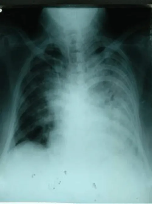 Both intra-operative and immediate post-operative period were very critical. His SaO2 dropped and ventilatory support, two inotropes, blood transfusion and fluids were given. Then, features of ARDS set in (Figure 5). Two days later, his condition deteriorated more and expired.