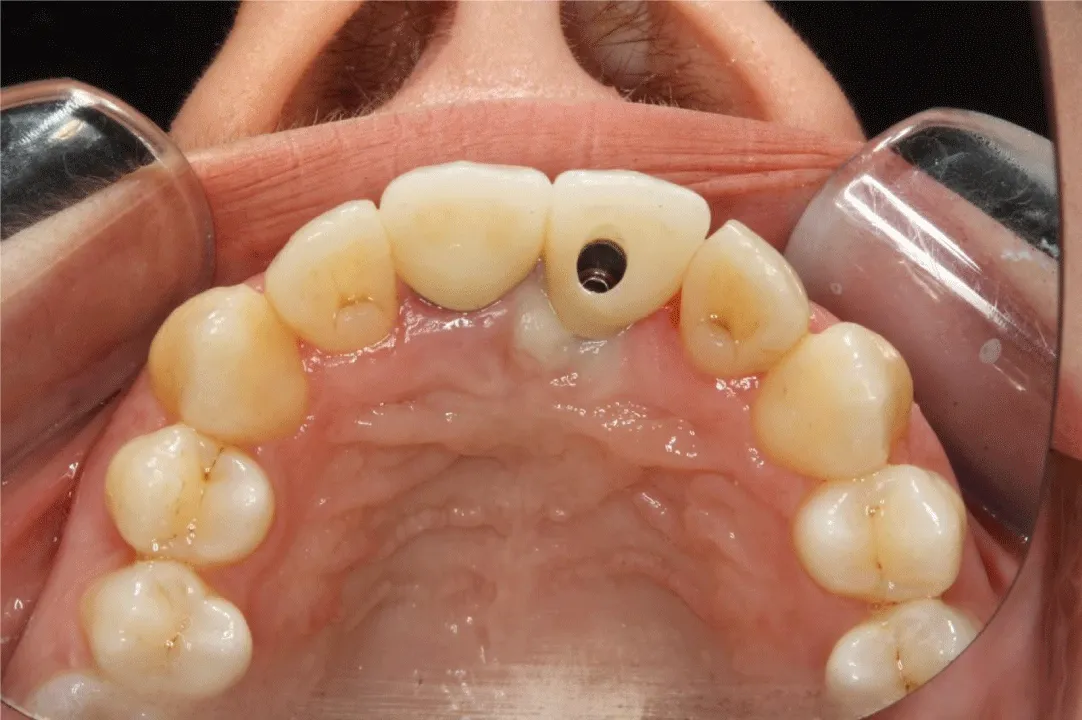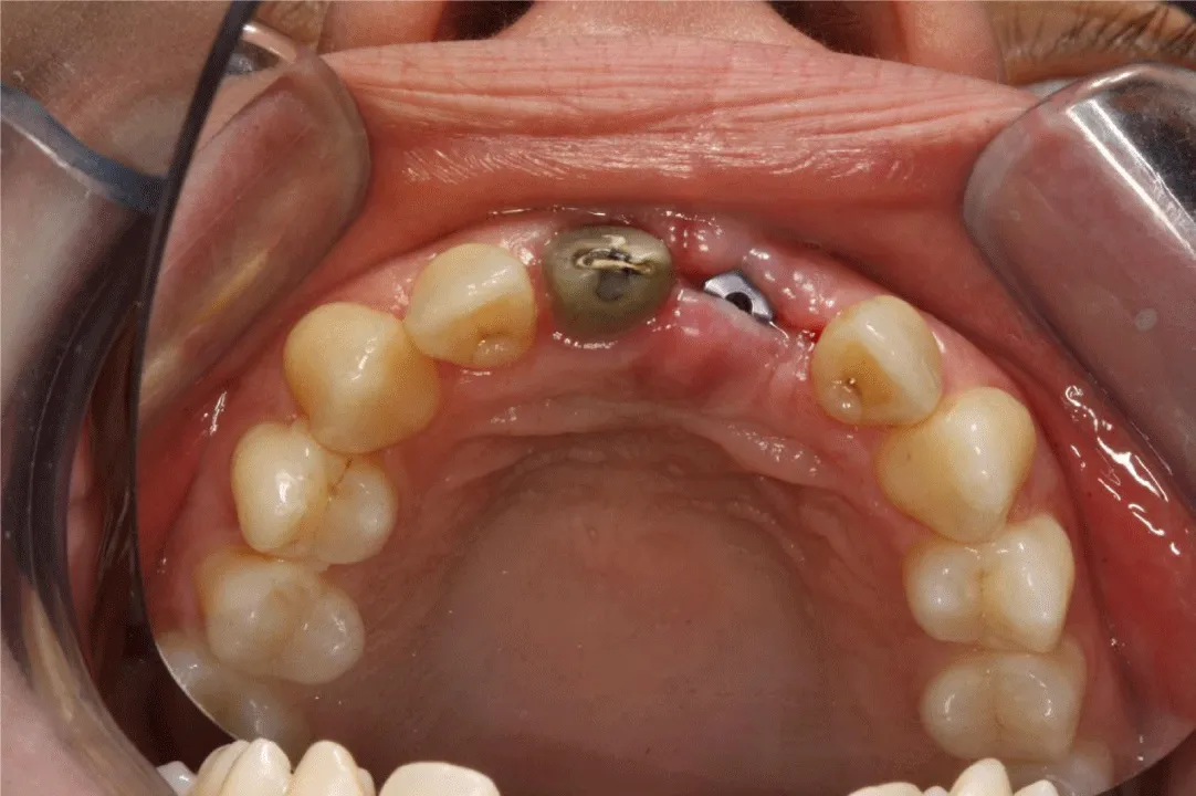 Two weeks later, a titanium dental implant (Brånemark System Mk III RP 3.75×18mm, Nobel Biocare, Gothenburg, Sweden) was placed in the position of the missing left central incisor (Figure 3). The implant achieved bicortical anchorage with adequate primary stability.