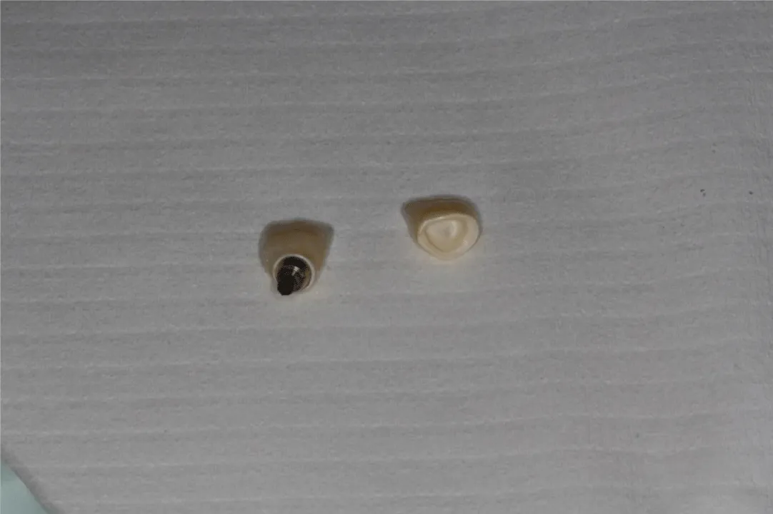 Final superstructures were then created (Figure 4). Try-in of the maxillary right central incisor’s all-ceramic crown and the metal framework of the left central incisor’s implant screw-retained metal-ceramic crown (FPD) was performed, in order to be sure about their passive fit and the occlusal alignment, and esthetics were verified prior to crown processing, by using table salt to minimize gag-reflex. An occlusal registration was performed using PVS material. The patient again played the instrument in the clinic to confirm the contour, before the final prostheses were screwed and cemented, accordingly (Figure 5).