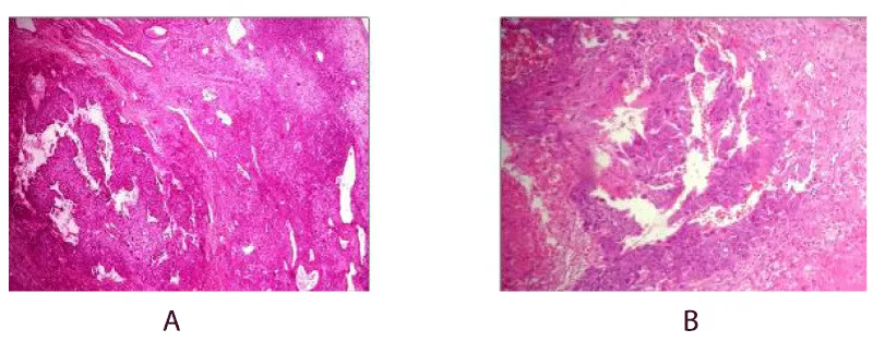 On physical examination, the patient with generalized pallor of the skin and integuments, hypotensive, tachycardic, diaphoretic, without cardiorespiratory compromise, globose abdomen due to abundant adipose panniculus, perstalsis present, pain on palpation in the right iliac fossa on bimanual touch, the uterus is delimited 8x5 cm, right annex, 12x9 cm adnexal tumor, irregular, firm, pain on cervical mobilization, with spotting-shaped transvaginal hemorrhage, extremities without edema, normal tendon reflexes. According to the clinical presentation, imaging studies, on suspicion of ruling out ectopic pregnancy, an exploratory laparotomy was performed, with findings of the right annex of 20x15 cm adhered to the uterus and sigmoid rectum without evidence of hemoperitoneum and a right salpingo-oophorectomy was performed for probable right ectopic pregnancy with hematic loss due to the surgical procedure of 40cc and sent to pathology for definitive histopathological study, during follow-up a control gonadotropin quantification was requested with the last report of 1 103 918.7 mUI/mL. The histopathological results of the macroscopic surgical specimen were right salpingo-oophorectomy, with choriocarcinoma with extensive necrosis, 1 cm tumor extension to the ovarian surface not identified, lymphovascular invasion present and free surgical margins of the residual ovarian tumor with cystic follicles, Figure 1 and the report microscopic, Figures 2-4. A new hCG quantification is performed, negative head tomography and chest tomography with probable metastasis due to pulmonary nodule, in abdomen and pelvis, presence of peritoneal carcinomatosis, with free fluid and lumbar puncture reports negative for malignant cells and chemotherapy based on cisplatin and etoposide 5 sessions and the patient is disease-free after two years of follow-up.