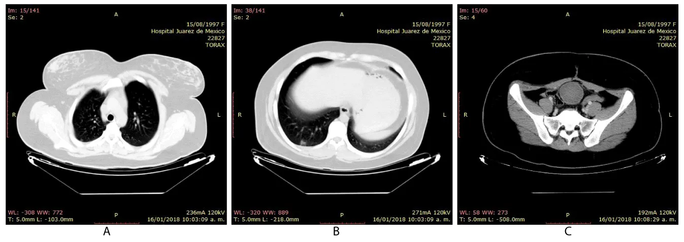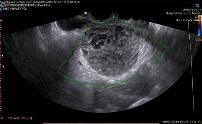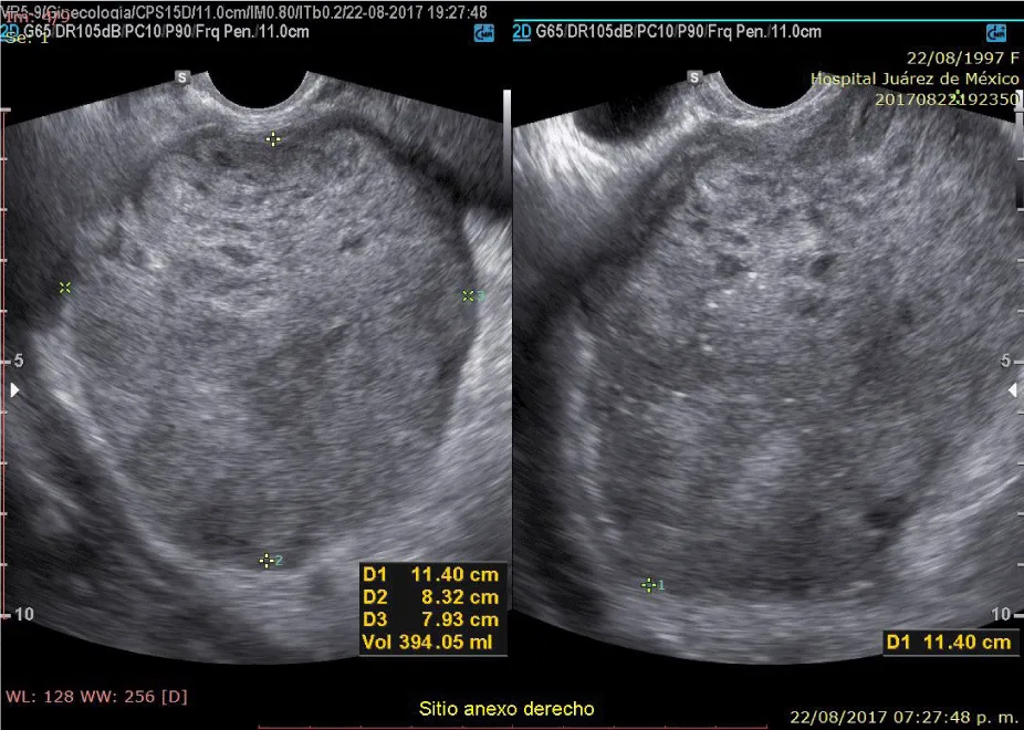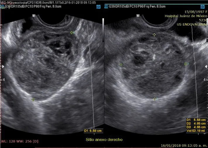 A 20-year-old married woman, with no history of pregnancy, who was admitted to the hospital for colicky abdominal pain in the right iliac fossa with radiation to the right iliac fossa from moderate to severe with Visual Analogue Scale with nausea and vomiting treated with analgesics presenting slight improvement; It is requested, quantification of the beta fraction of gonadotropin with figures of 112,337 mIU/mL and pelvic ultrasound with a report of a complex cyst of the right ovary without evidence of free fluid in the cul-de-sac; in relation to probable dysgerminoma or tumor of etiology to be determined; the hematic biometry with hemoglobin of 15.8 and hematocrit of 45, platelets of 313,000, leukocytes of 11,300 and 2 bands; reason for which she is referred to Hospital Juárez de México and once hospitalized; on August 18, 2017; she presents low-cost symptoms; and the studies are repeated quantification of beta fraction of Human Chorionic Gonadotropin (hGC) greater than 5,000, hemoglobin of 18 grams, hematocrit of 47%, leukocytes of 12,000, platelets of 367,000, lactic dehydrogenase of 473, direct bilirubin of 0.8 and the 2.3 total; normal liver transaminases; Ultrasound reports uterus in anteversion of 79x26x31mm, homogeneous myometrium, endometrial thickness of 7.9mm and right annex with lesion of 114 x83x79mm and total volume of 394cc, heterogeneous with linear images in its interior punctiform, the ultrasound diagnosis was, probable right annex teratoma tumor cystic.