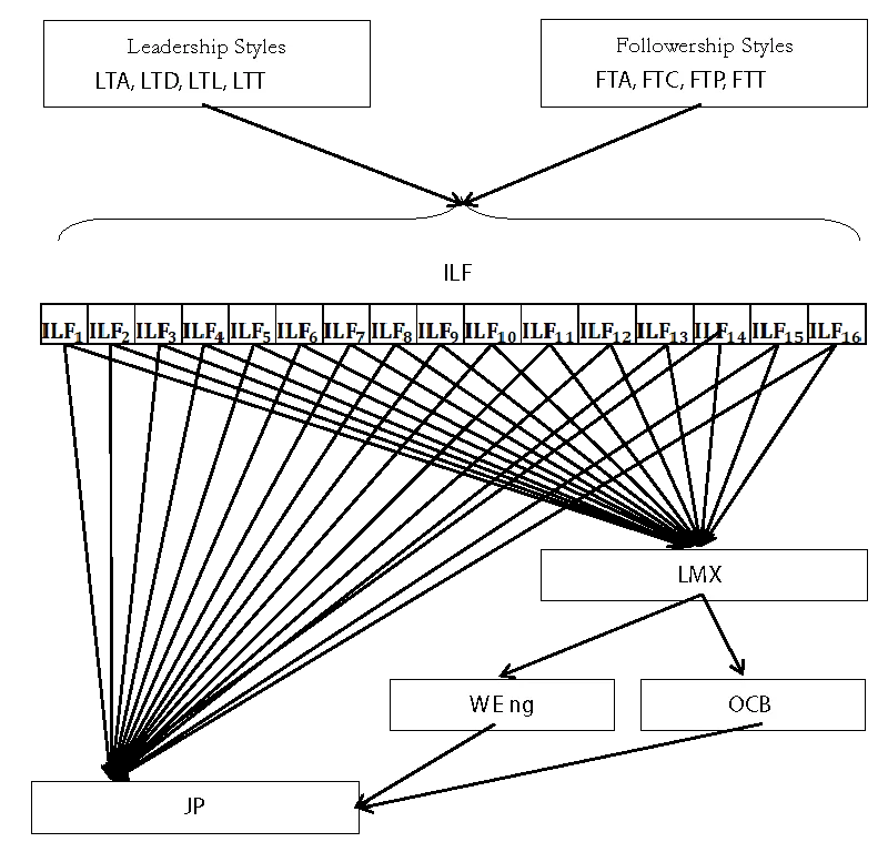 Table 2 and Figure 1 present the means, standard deviations (S.D.), and loading of all the studied variables, and R2 for LMX, OCB, WEng and JP. From Table 3, the means of ILF4, ILF12, ILF13, ILF14, ILF16 are lower than 9, so there might be lower recognition of respondents for some perceived interactions between leaders and followers, as FT⊗ALTT, FTP⊗LTT, FTT⊗LTA, FTT⊗LTD, and FTT⊗LTT, and the key factors should be FTT and LTT. From Table 3, ILF, LMX, OCB, WEng and JP variables with the bigger S.D. range are ILF1, ILF5, ILF9, ILF12, ILF13, so there might be lower recognition of respondents for some perceived interaction between leaders and followers, as FTA⊗LTA, FTC⊗LTA, FTP⊗LTA, FTP⊗LTT, and FTT⊗LTA, and the key factors should be LTA. From R2 and adjusted R2 Table 2, OCB with their lowest values might be least interpreted by ILF.