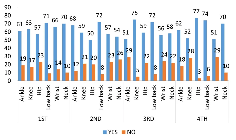 In this study 80 farmers were analyzed that their mean height was 5’.7’’± 3’.75’’ inches, body weight was 80.25 ± 5.14 kg, mean age was 29.85 ± 3.25, BMI was 22.71 ± 2.75. 6th month earlier response about musculoskeletal symptoms were recorded in Table 1. This table shows that neck, wrist, low back with 75%, 77.5%, 66.25% respectively have the most musculoskeletal problems in farmers. After that ankle, knee, hip with 90%, 83.75%, 77.5% respectively have the most musculoskeletal problems in farmers during 1 month earlier response about it (Table 2). We checked prevalence of MDS in different phases of harvesting, in 1st phase low back, neck, wrist with 88.75%, 87.5%, 82.5% respectively have the most musculoskeletal problems in farmers during sedentary picking up with hand (Table 3). In 2nd phase low back, ankle, knee with 90%, 85%, 73.75% respectively have the most musculoskeletal problems in farmers during standing picking up with sickle (Table 4). In 3rd phase knee, low back, hip with 93.75%, 90%, 73.75% respectively have the most musculoskeletal problems in farmers during collecting harvests from farm (Table 5). In 4th phase hip, low back, ankle with 96.62, 92.5%, 77.5% respectively have the most musculoskeletal problems in farmers during packing (Table 6). Overall phase’s results are shown in Figure 1.