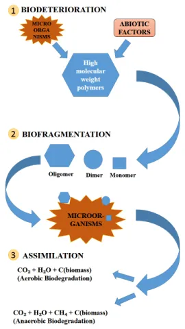 The process of polymeric biodegradation involves several stages and cessation can occur at any stage. The process comprises three major steps which are biodeterioration, biofragmentation and assimilation [46] as shown in figure 2.