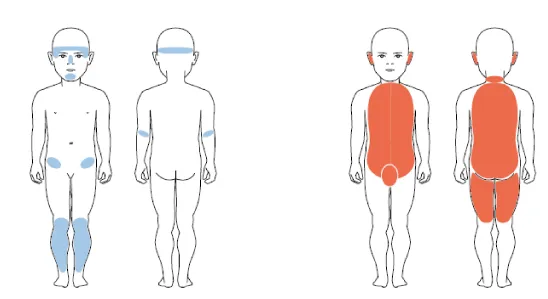 f) Thermal injuries: Most burns caused by an accident occur when the child takes hot drinks or dishes from the table or kitchen counter. This is only possible if the child has reached a certain stage of psychomotor development. From a similar accident a typical localization of the results of the burn: the chest, belly, possibly shoulders and chin are affected. The depth of the sunburn decreases in the craniocaudal direction. Another frequent scalding situation occurs when a parent or another person holds the child with one arm or knees and a boiling drink in the other hand. Sunburns due to mistreatment usually have sharp contours and are located mainly on the hands, feet, and in the anogenital area. They are parts of the body where a child cannot get a sunburn without the intervention of third parties, except possibly for the hands and feet, but in this case, they would have a different configuration. Furthermore, children touch hot objects or fire only because they do not recognize the danger (hot plate, red-hot oven door, etc.) or because they fall or trip over. Accidental contact with hot objects usually results in injuries to the palms of the hands or feet; in falls, burns are often combined with other injuries. Footprints of hot objects (grids, irons, and cigarettes) always give rise to suspicion of mistreatment, except for clinical syndromes able to explain the findings, such as dermatitis, Staphylococcal combustible syndrome, Epidermolysis bullosa and popular therapeutic practices of the Far East (cupping).