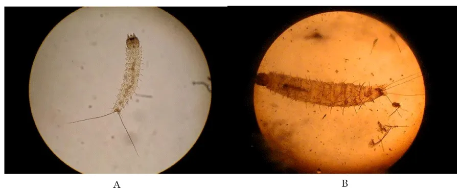 The first instar larvae with two caudal bristtles the third instar larvae with traces of T. vogelii in the fore gut, and with four caudal bristles are shown in Plate 1.