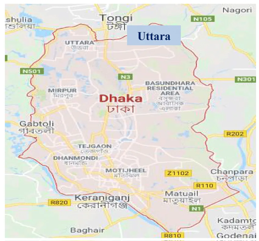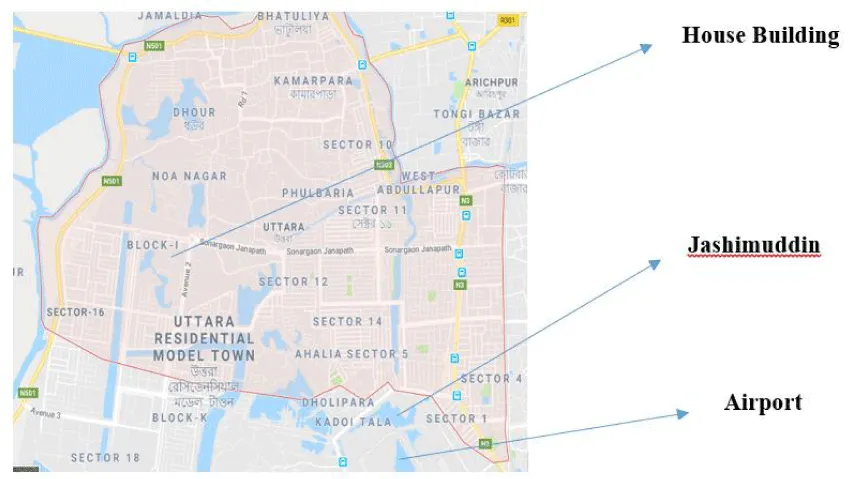 The Uttara area of Dhaka city is a suburb which is up and coming, has a huge population and has faced the resultant congestion on roads due to more people opting for private modes of transportation. This is mostly because of the lack of security in the public transportation, the harsh behavior of the staff, the lack of fi tness of the buses and several other associated issues. What is important to note is that Uttara (Figure 1) is one of the prime areas of Dhaka city as it is adjacent to several important landmarks of the capital like the international airport, airport railway station and various important commercially areas like Savar, Gazipur and Ashulia. It is also home to over 179,000 residents [3] who have children going to schools, parents going to work and relevant facilities like hospitals, malls and so on.