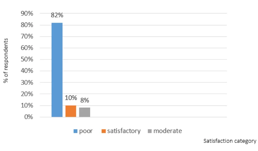When asked about their opinion on the physical condition of the buses, 82% of the respondents said that they think the condition of the buses are poor while 10 percent think it is satisfactory and 8% think it is moderate (Figure 4). Upon being asked about seating, 68% of the respondents said that they fi nd seats available in the bus while travelling and 32% of them said they fi nd buses to be over crowded. These responses revealed that most of the passengers do not get seats while travelling. The bus passengers were further asked about the satisfaction level regarding the behavior of the bus staffs. 78% of the respondents, i.e., the majority, responded as beingdissatisfi ed with their behavior, while 22% said that they are satisfi ed with the behavior. Thus, it can be concluded that most of the respondents are dissatisfied with the present bus service system.