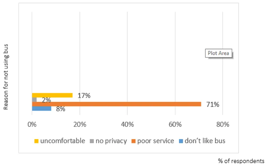 The results from the questionnaire therefore concluded that the bus passengers, as well as car users are not happy with the bus service system and they want a more reliable, comfortable bus service system in the area so that they can have a better travelling experience.